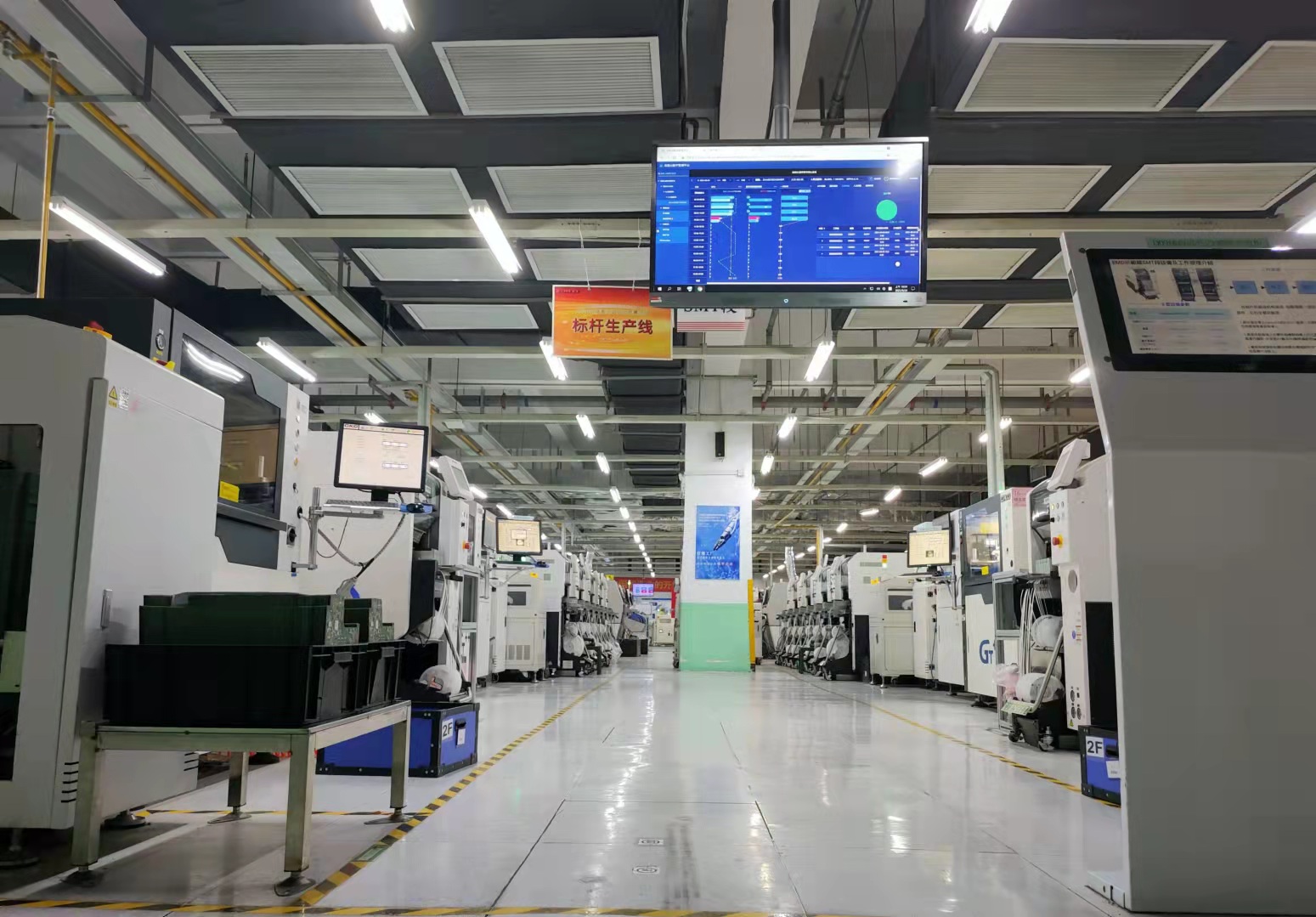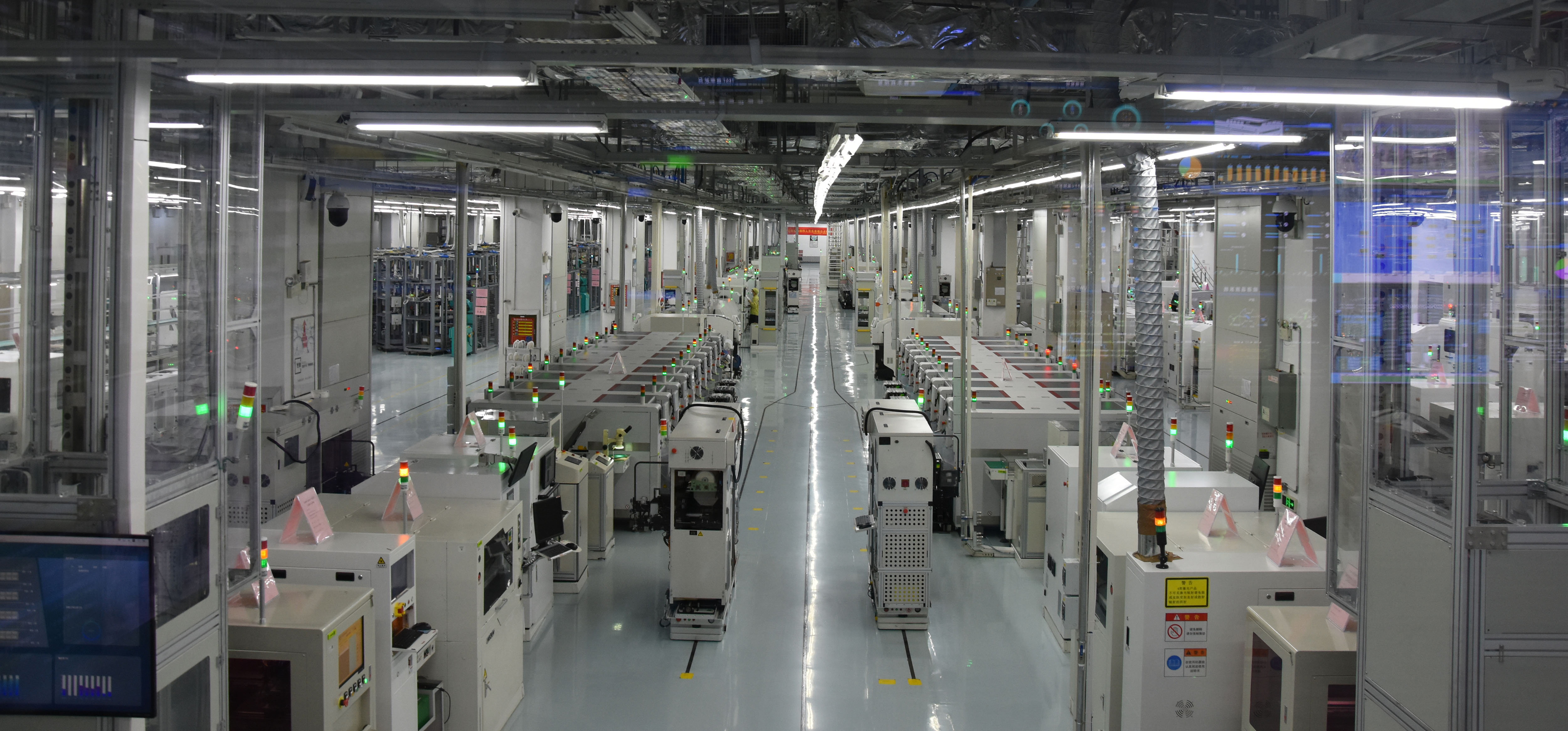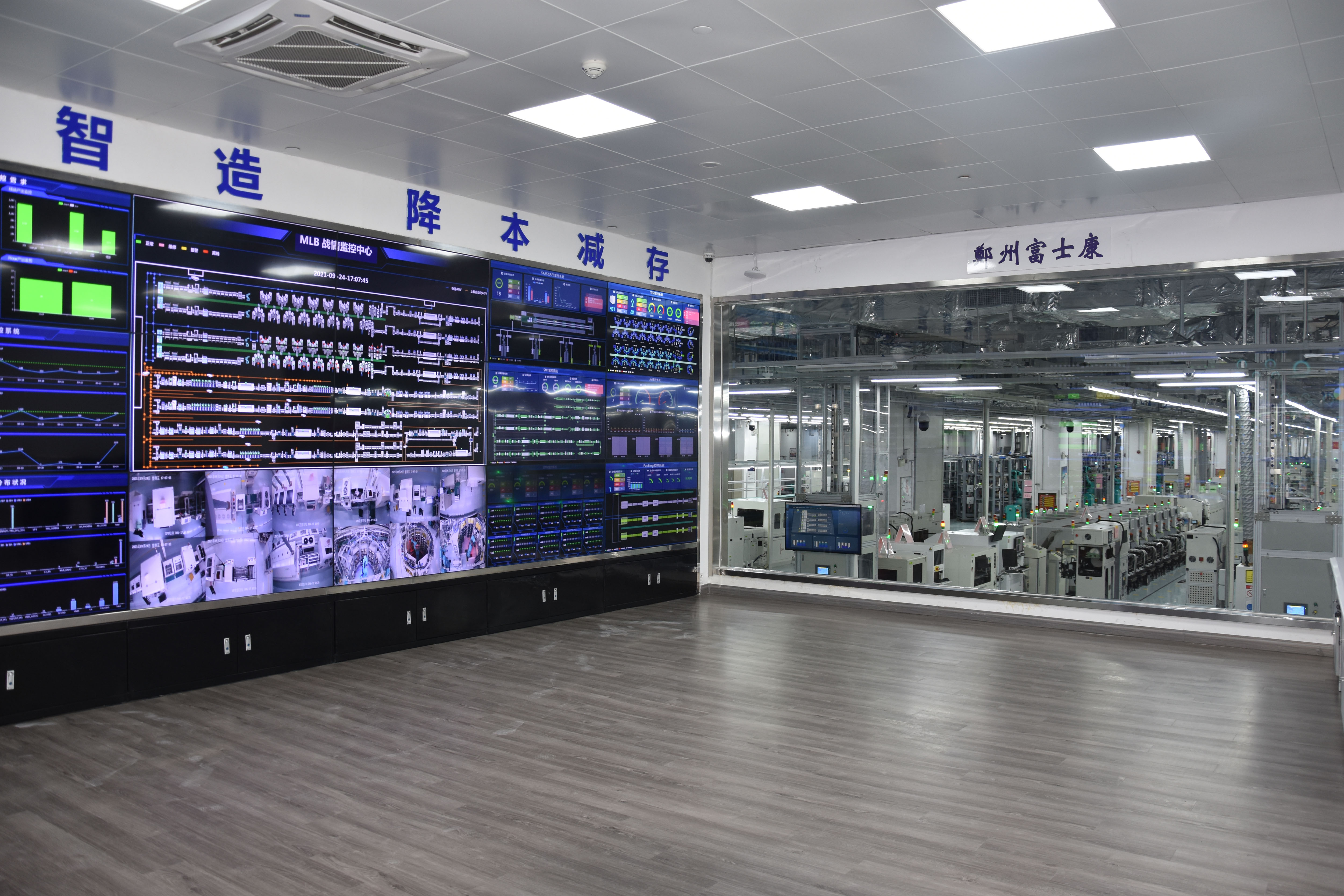 鴻海鄭州廠區燈塔工廠車間場景,自主開發柔性自動化,實現全工站、全製程、全連接自動化生產,生產互聯互通設備,提升生產效率及品質。