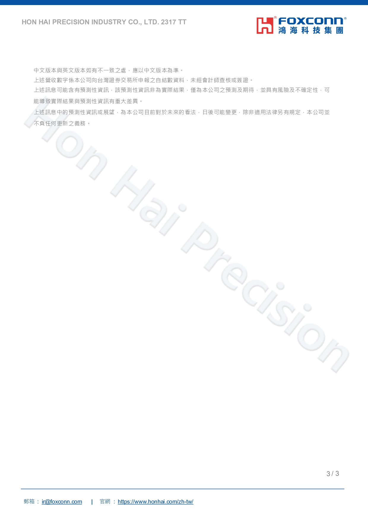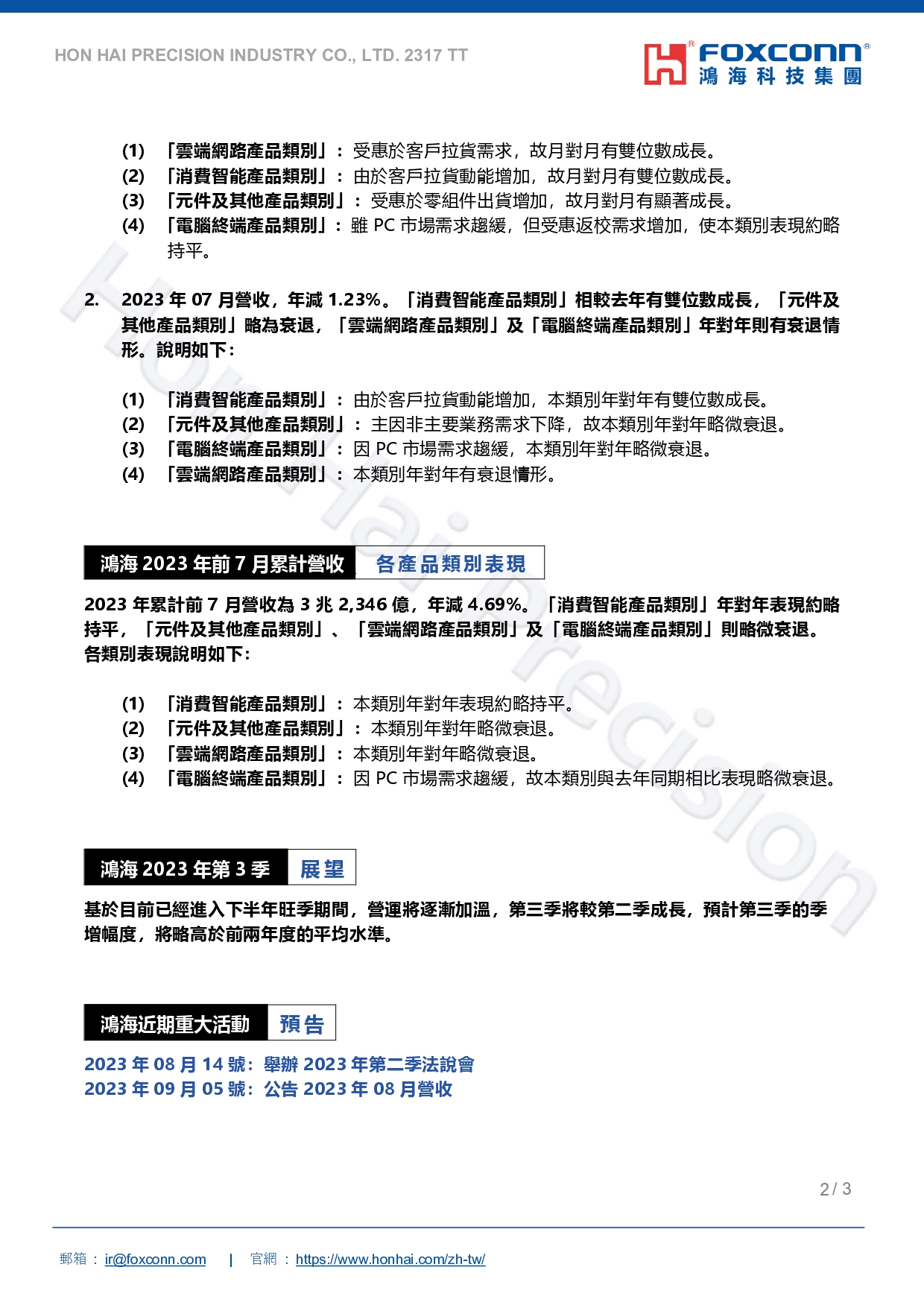 鴻海精密工業股份有限公司公告2023年07月自結合併營收