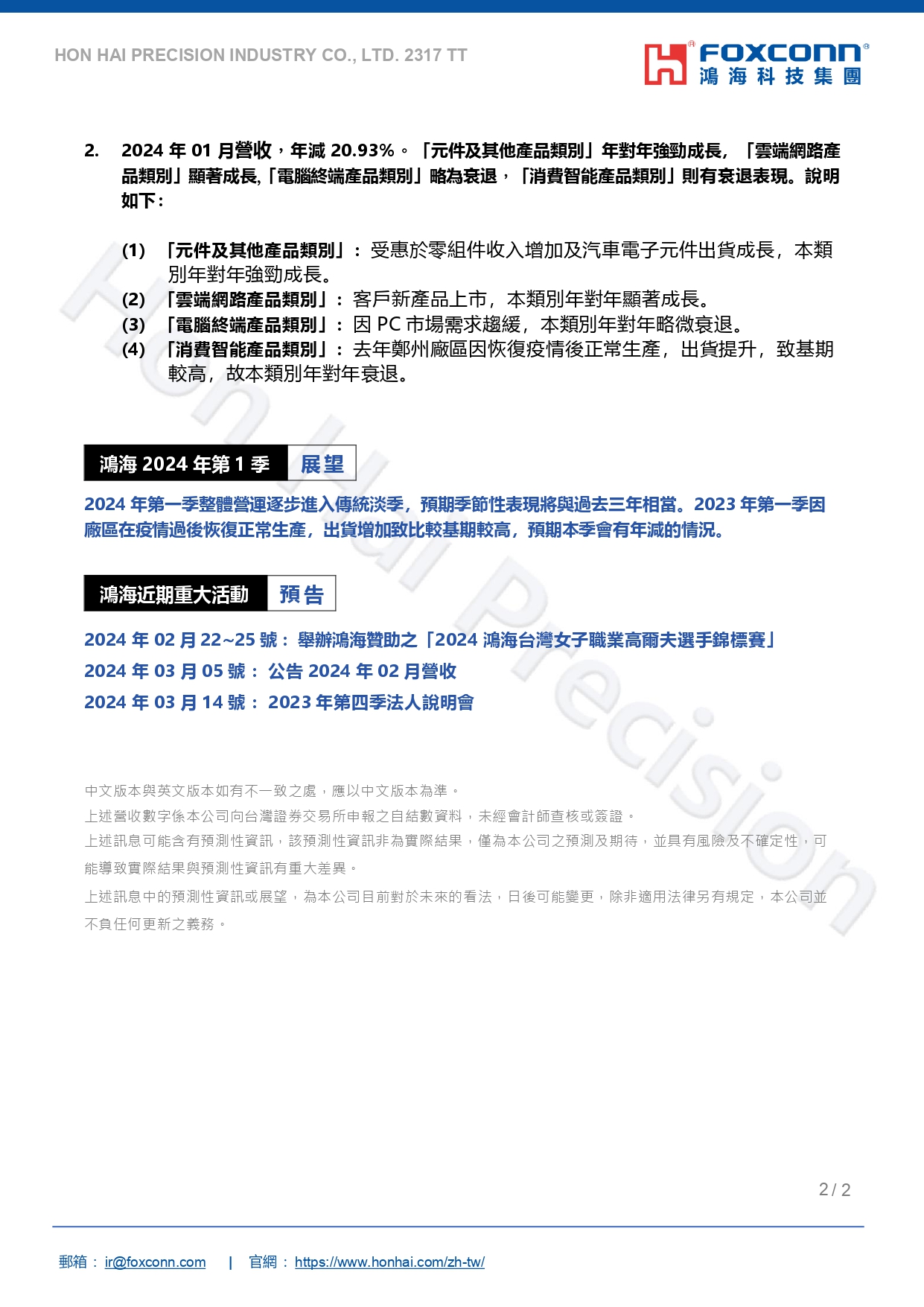 鴻海精密工業股份有限公司公告2024年01月自結合併營收