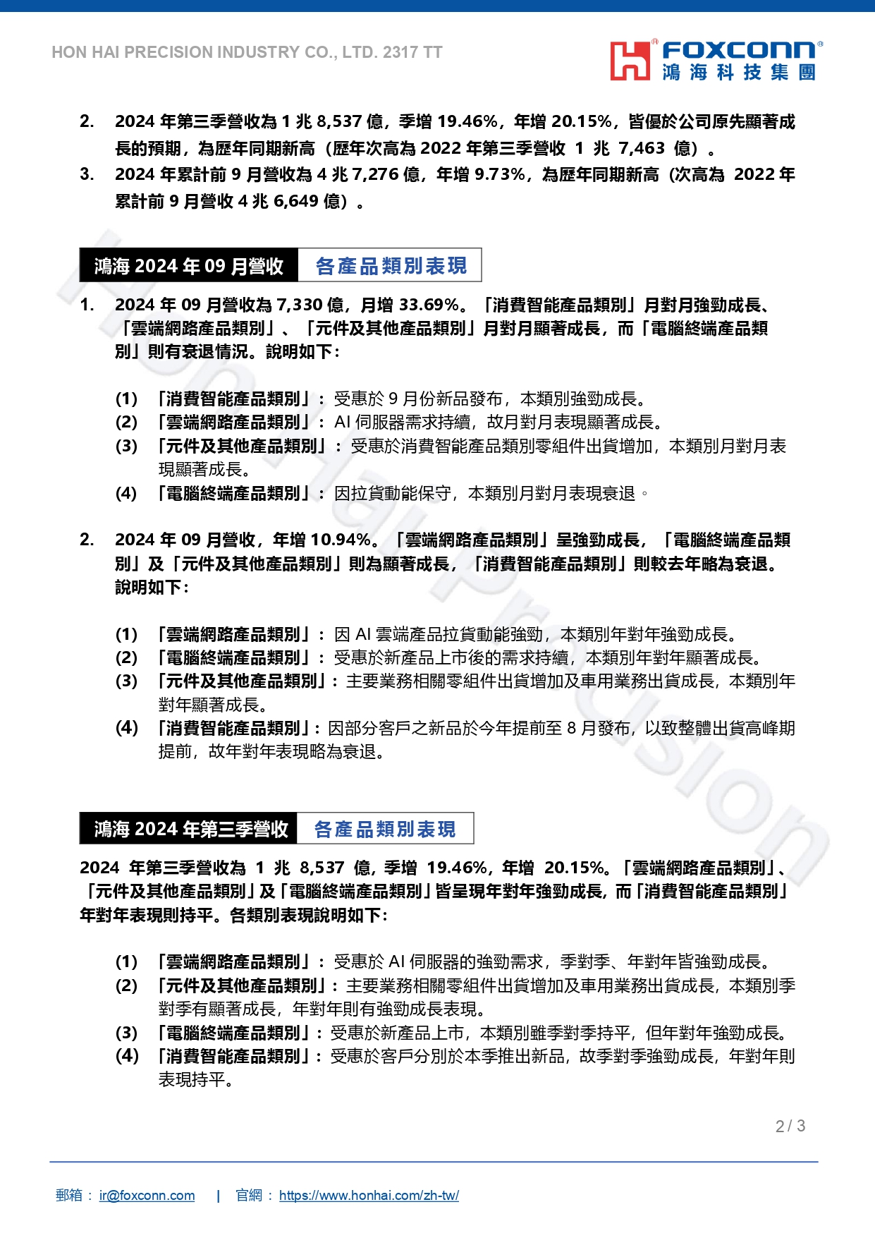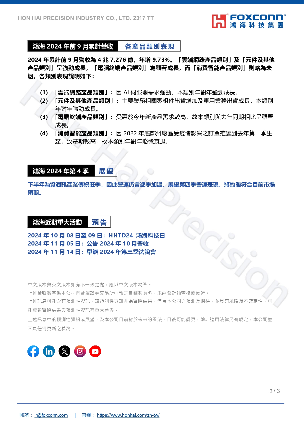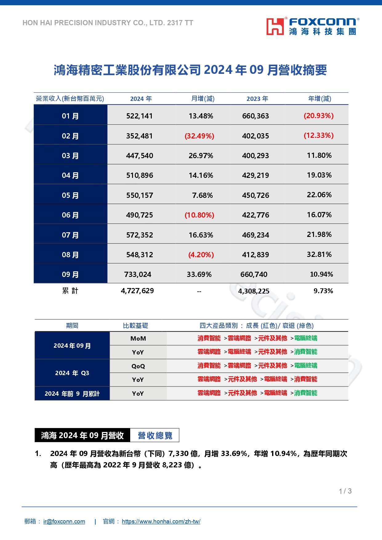 鴻海精密工業股份有限公司公告2024年09月自結合併營收
