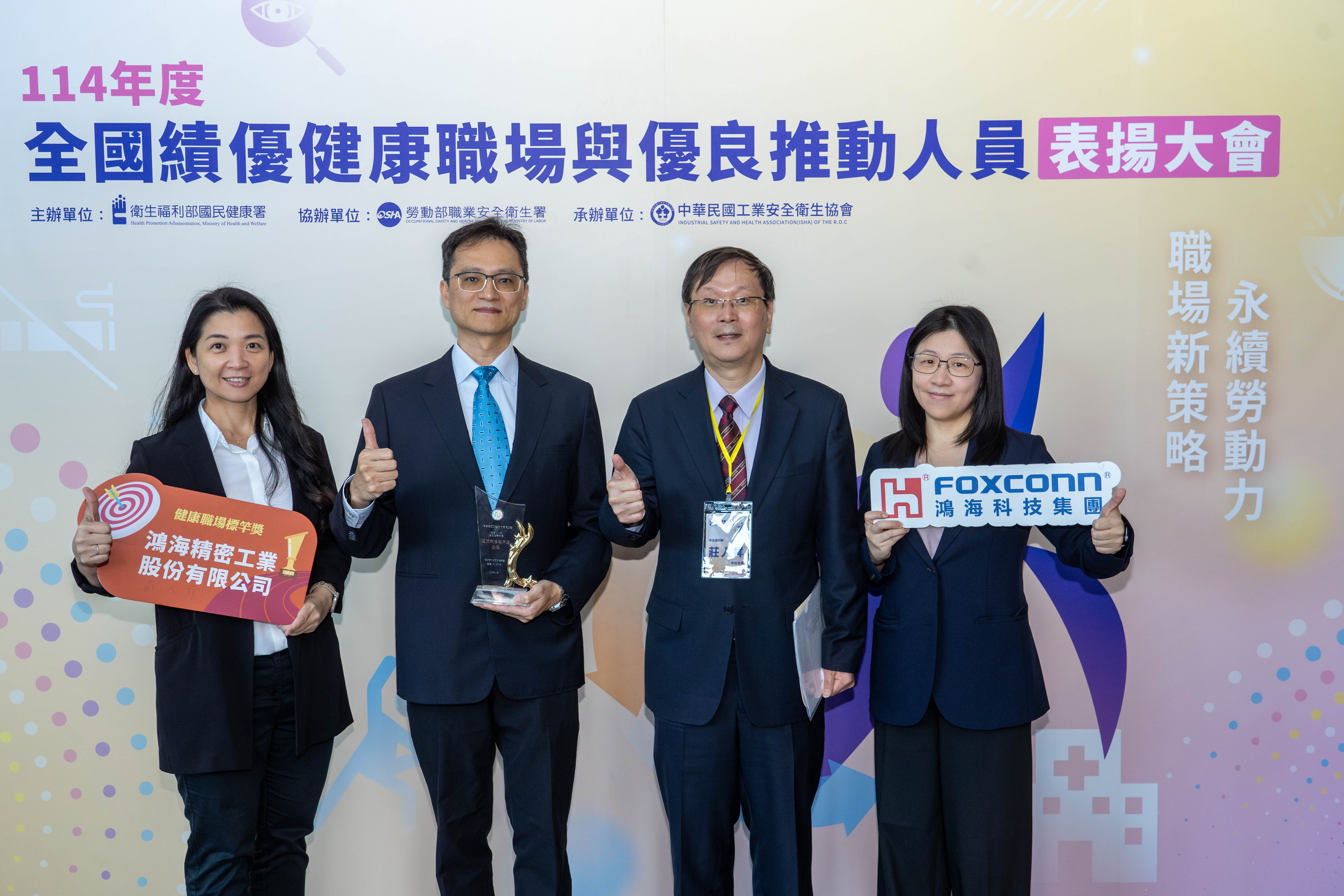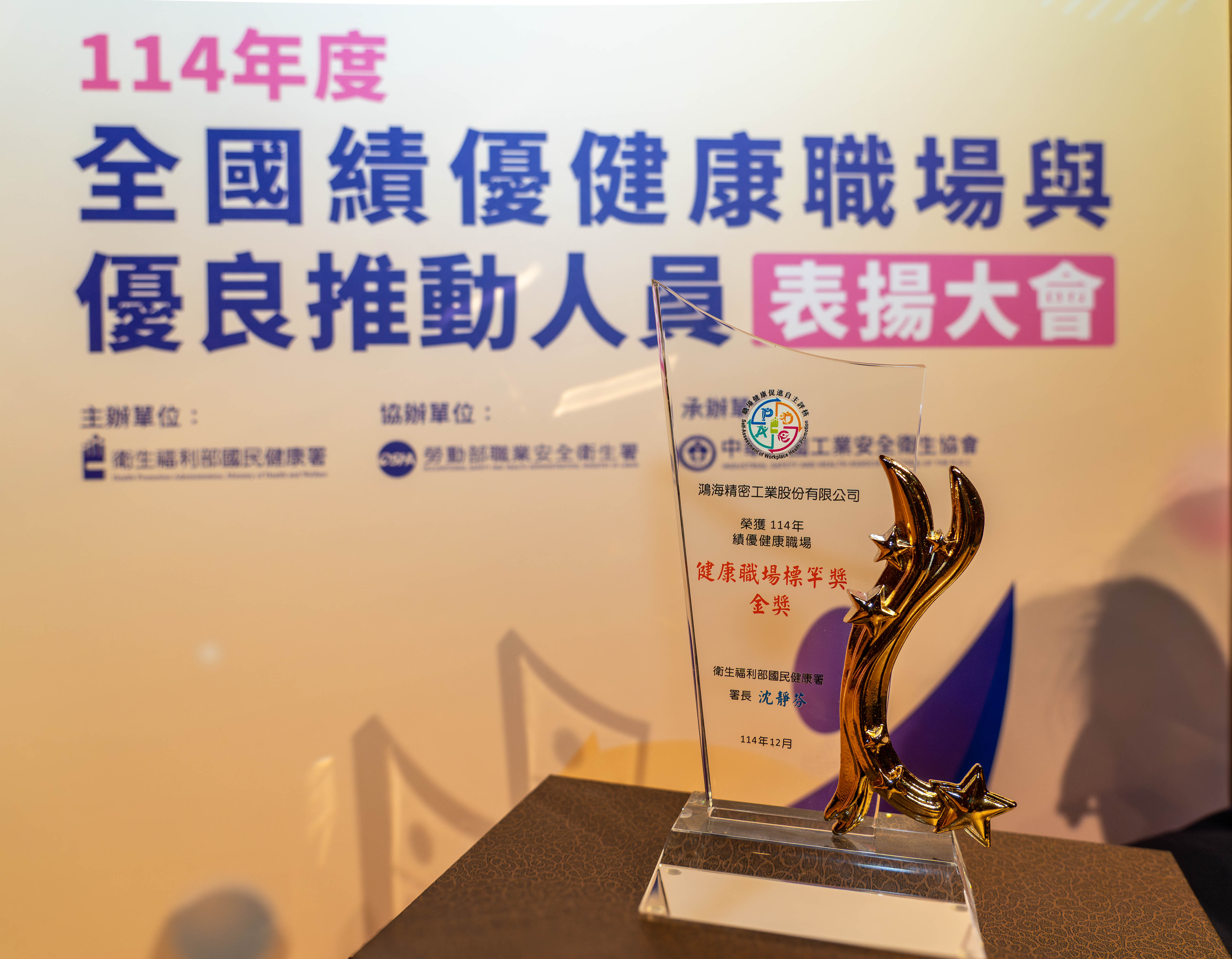 【台灣台北–2025年12月10日】鴻海科技集團今(10)日宣布,榮獲衛生福利部國民健康署「114 年度健康職場標竿獎-金獎」,肯定公司在員工健康照護、慢病預防與健康支持體系上的成果。績優職場認證今年全面調整認證機制與獎項分類,鴻海經過兩階段的書面評核、面試後,在346家申請企業中脫穎而出,榮獲健康職場標竿獎項金獎,這代表公司健康管理團隊在推動具有特色的健康管理與促進作為,成效卓越。